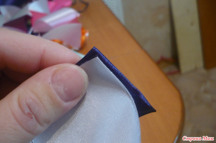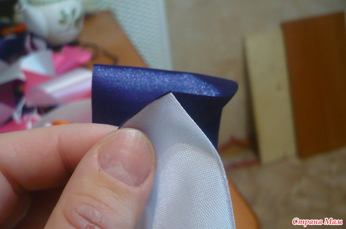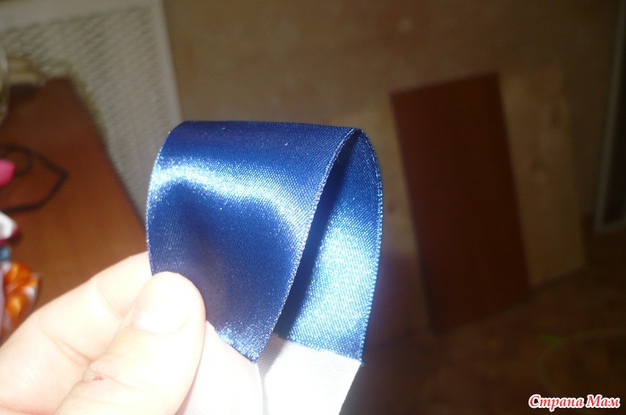 1. Атласная лента шириной 5 см. двух цветов. Можно так же взять ленту шириной 4 см. (получается небольшой аккуратненький бантик и смотрится очень красиво.) в данном случае при такой ширине ленты следует вырезать отрезки по 8 см. + 2мм припуск