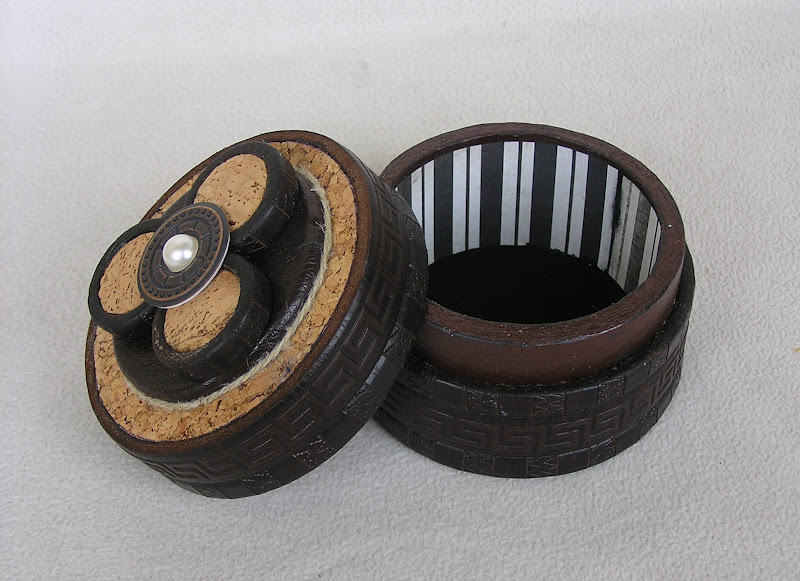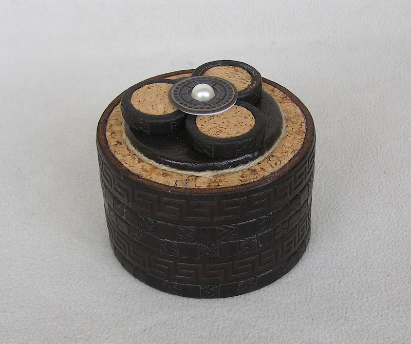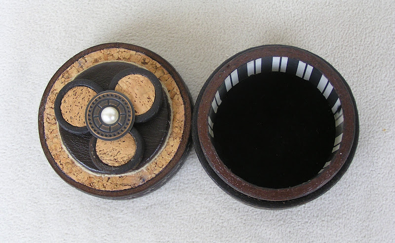 Шкатулка сделана из бобины от скотча и старого мужского ремня. Скажу по секрету, все это лежало уже не один месяц и ждало своего часа и, как это обычно бывает, дождалось :-) Оформить крышку мне удалось с помощью пробочного листа, обрезки который я выпросила у мужа на работе :-)
