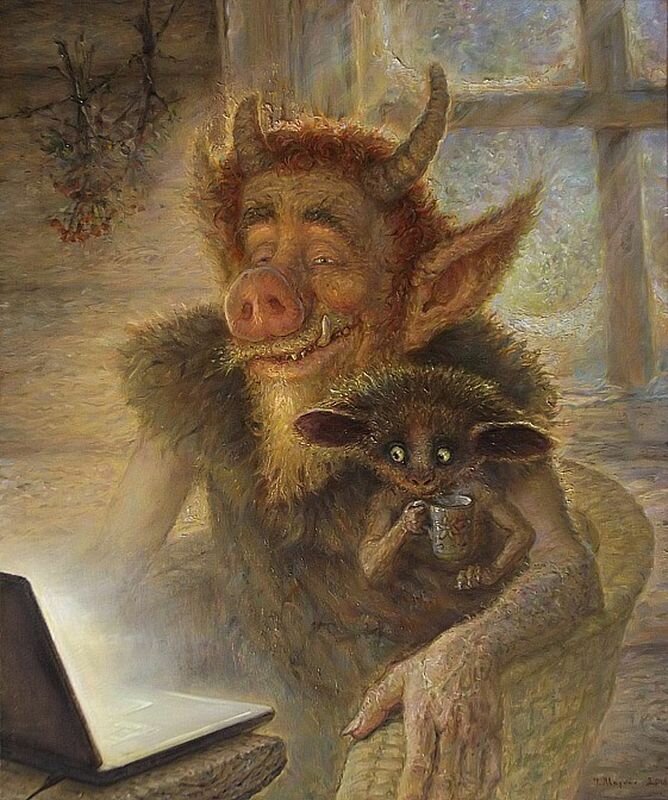 Картины Игоря Валерьевича Майкова завораживают прежде всего необыкновенным светом, его работы светятся откуда-то изнутри. И все время не покидает чувство, что все эти коты и прекрасные дамы, лешие и вороны, лесные феи и прочие сказочные персонажи и известные всем литературные герои живут здесь вполне реальной и не застывшей жизнью. Картины этого замечательного художника, который родился в Риге в 1966 году, поражают своей пышной сюрреалистической красотой.