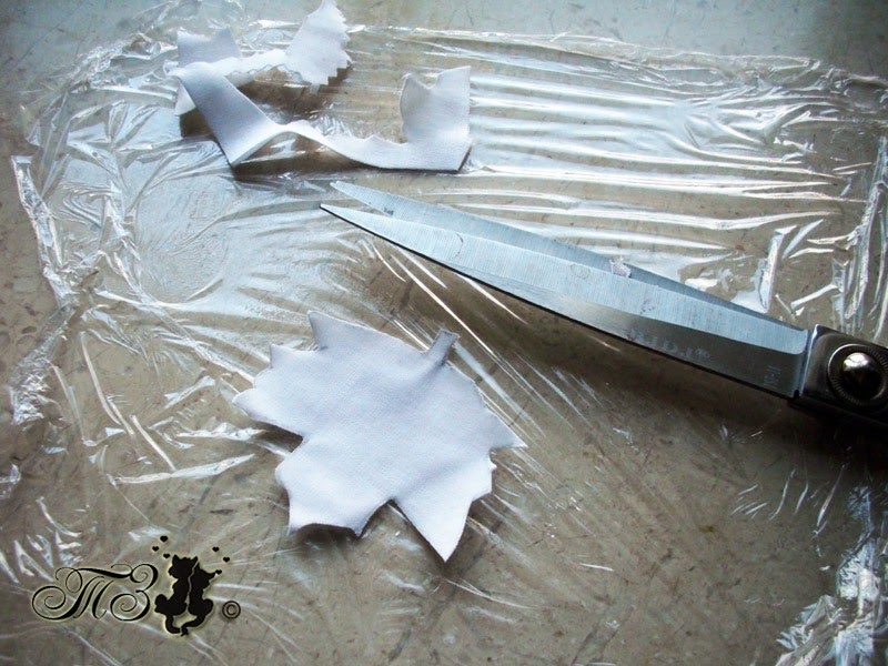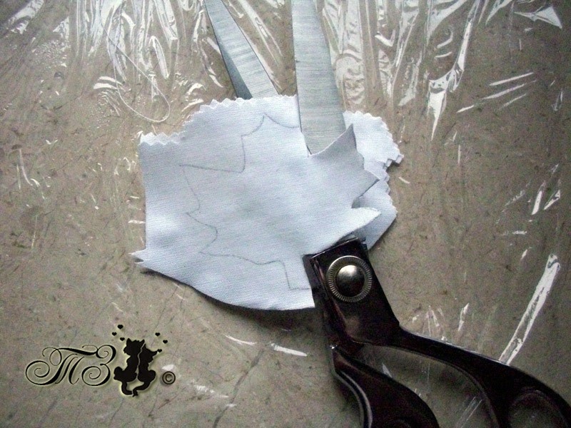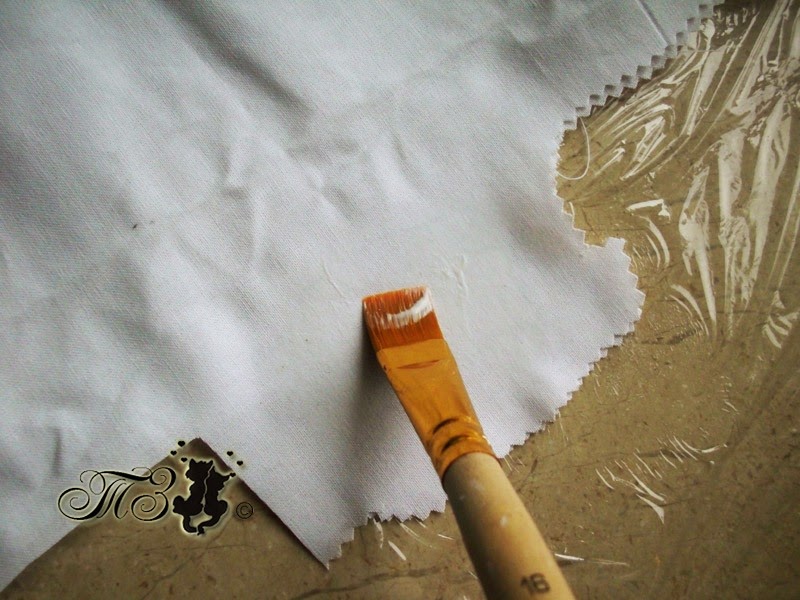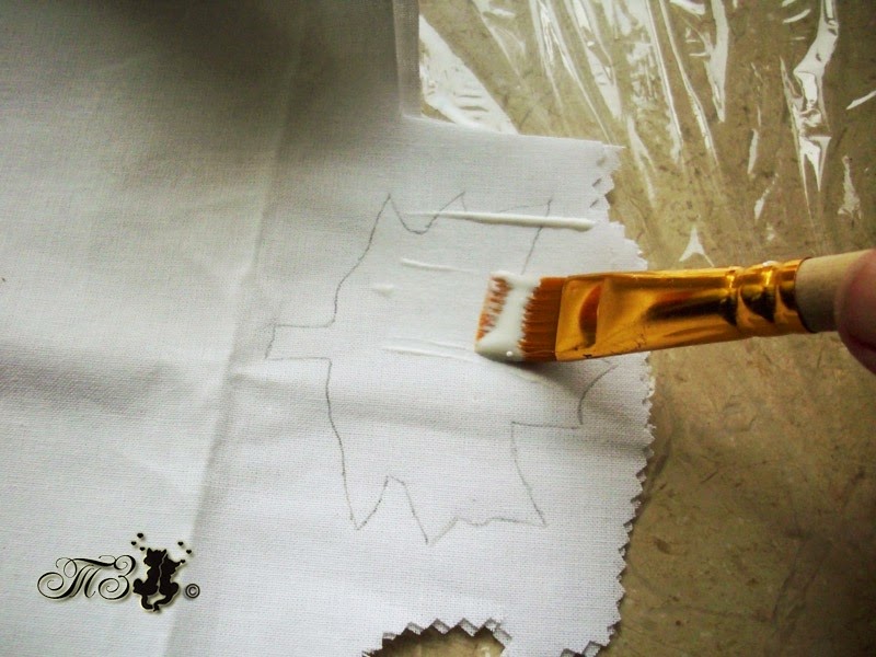 Не вырезая, широкой кистью тщательно, без пропусков, промазываем ткань клеем ПВА, немного выходя за контуры рисунка. Чтоб не испортить клеем рабочую поверхность, я подложилала пищевую пленку.