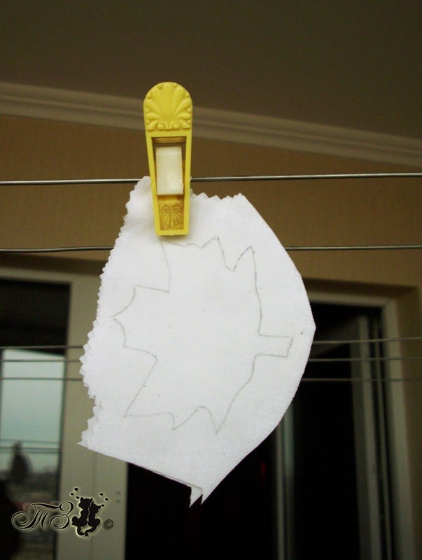 Вырезаем из бумаги шаблон нужного листа, в данном случае я использовала кленовый лист, который был в выкройке Юлиного Коня. Обводим простым карандашом (нежирно, только, чтоб обозначить контур) шаблон листа на сложенной вдвое ткани.