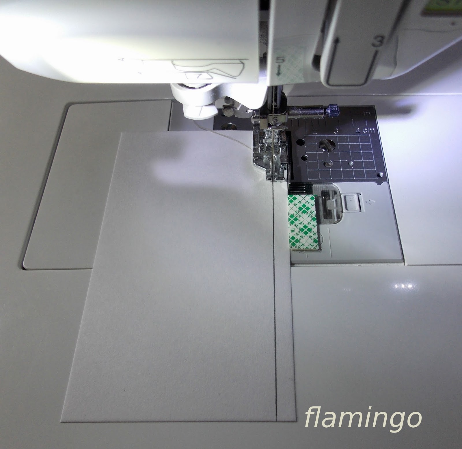 Сразу становится видно, как нужно вести ткань по отношению к своей лапке. Если у вас все точно все так же, как и в работе с тканью, следующий шаг не для вас. Если же есть небольшое отступление от ограничителя , или специальная лапка и вовсе отсутствует, сделайте свой дополнительный ограничитель-направитель. Очень хорош для этого толстый плотный скотч многоразового использования. У меня нашелся такой.