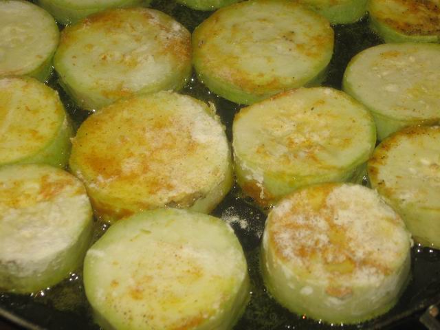 Обваленные кружочки кабачков обжарить на растительном масле до золотистого цвета.