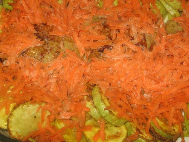 Сверху присыпаем морковкой, заливаем всё сливками или молоком. Не надо много. Достаточно 1 стакан.