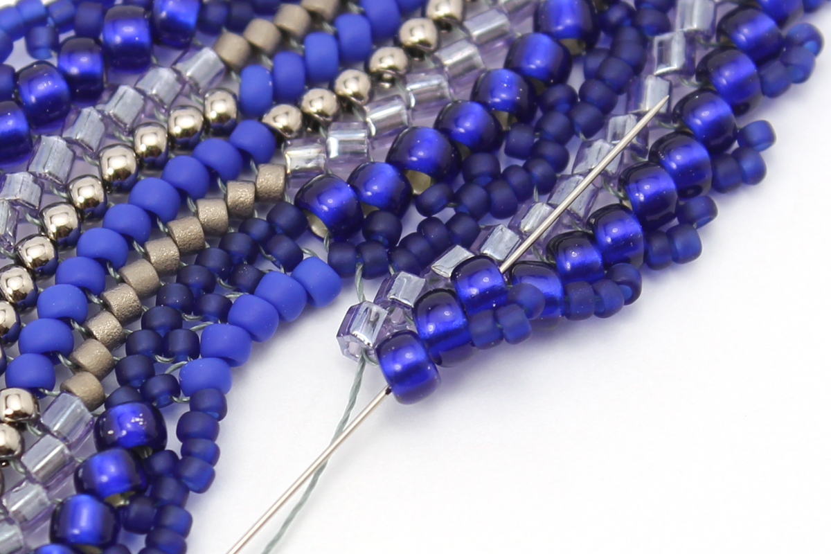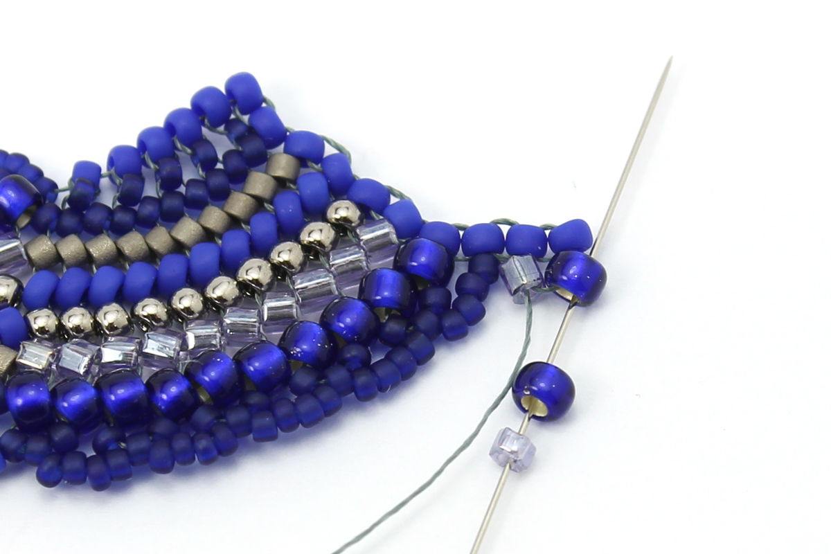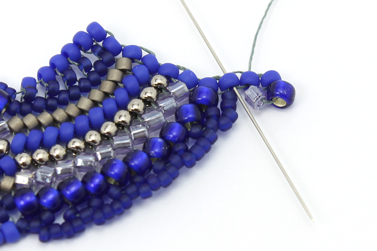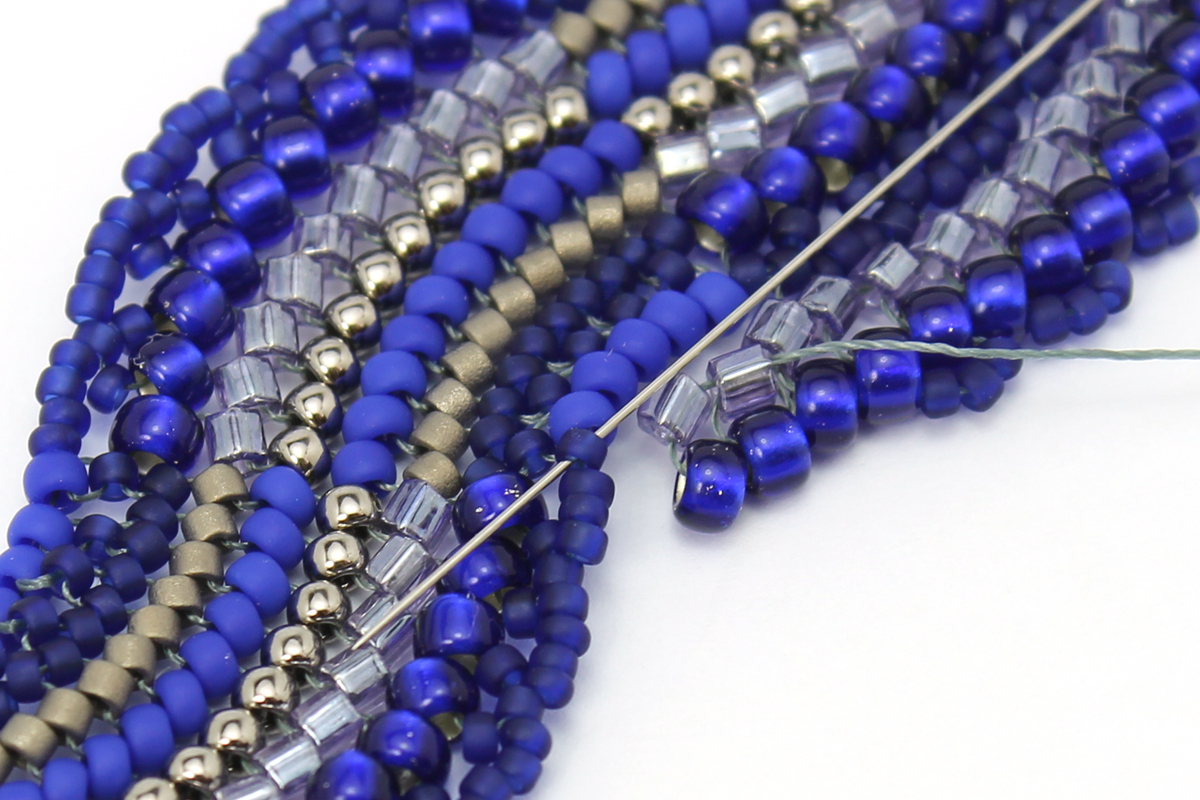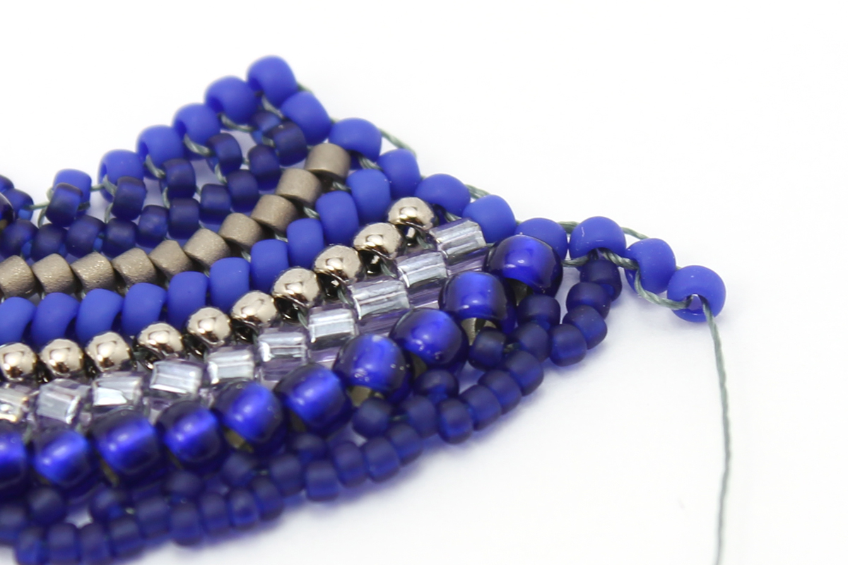 Плетем еще один ряд - завершающий, с бисером 11/0 #48F. Проплетаем этот ряд в обратном направлении, чтобы закрепить бисерины.