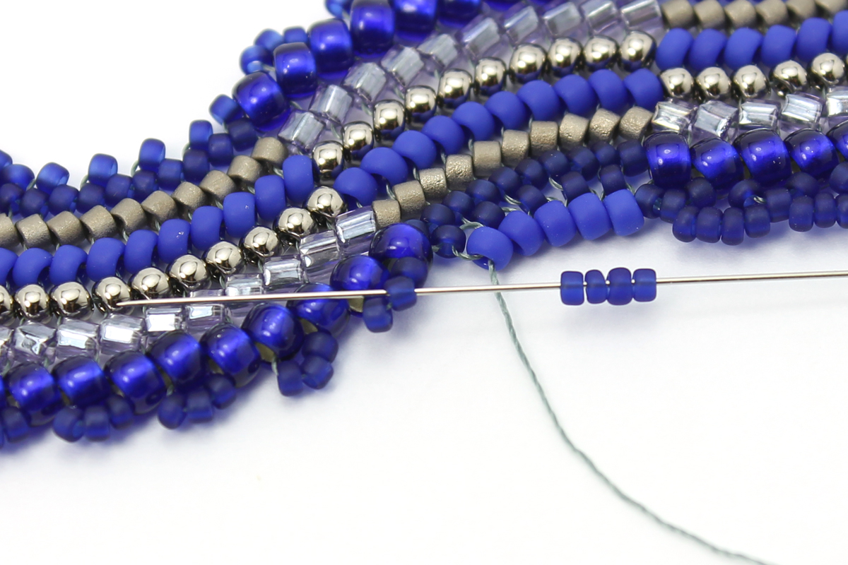 Приплетаем по 4 бисерины 15/0 между центральными бисеринами, образующими петли по краям волны.
