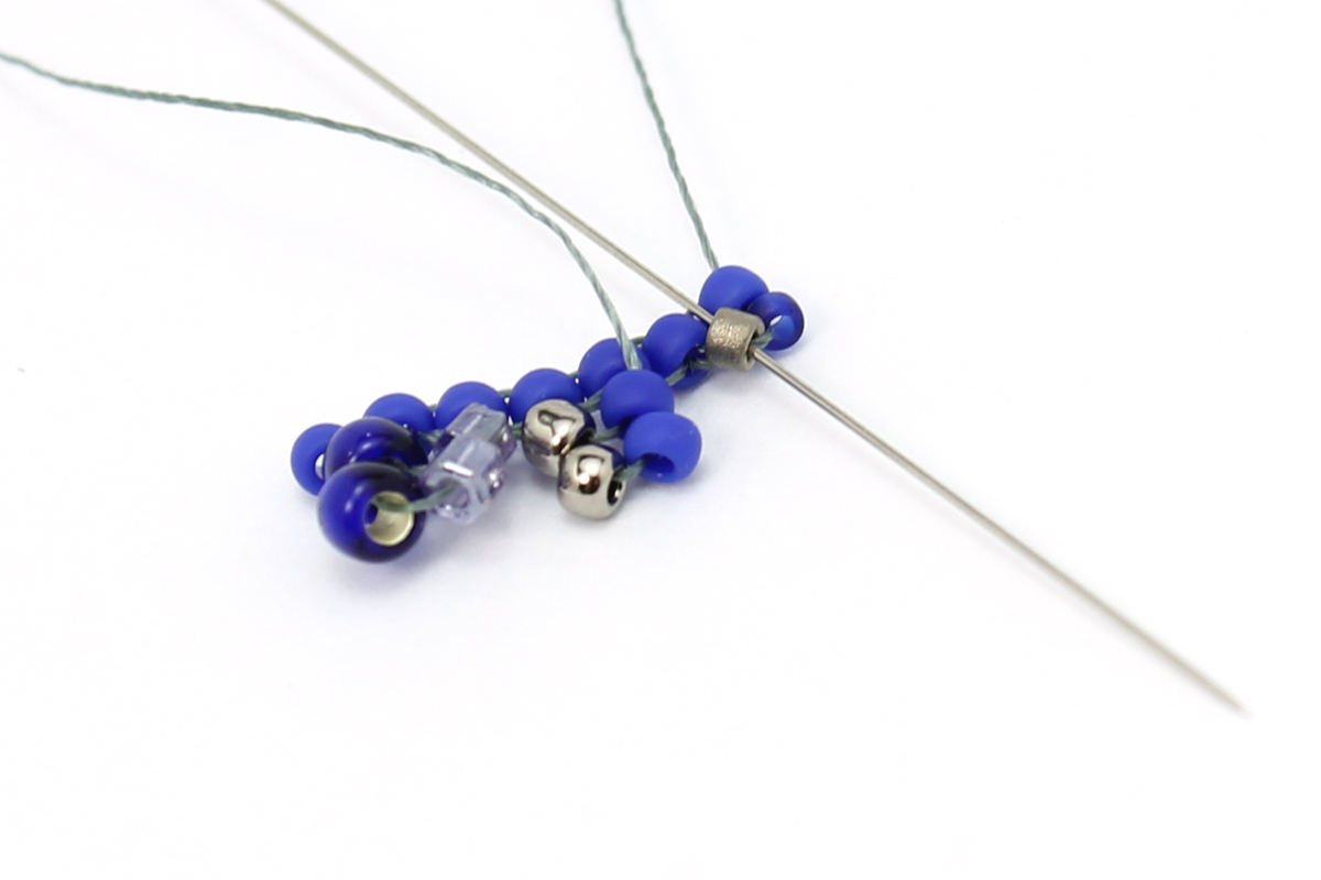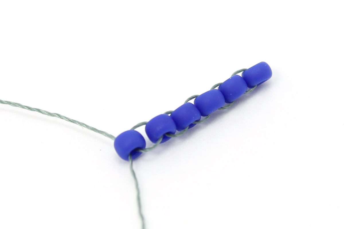 Набираем 1 бисерину 15/0 и проходим иглой через крайнюю бисерину 15/0.