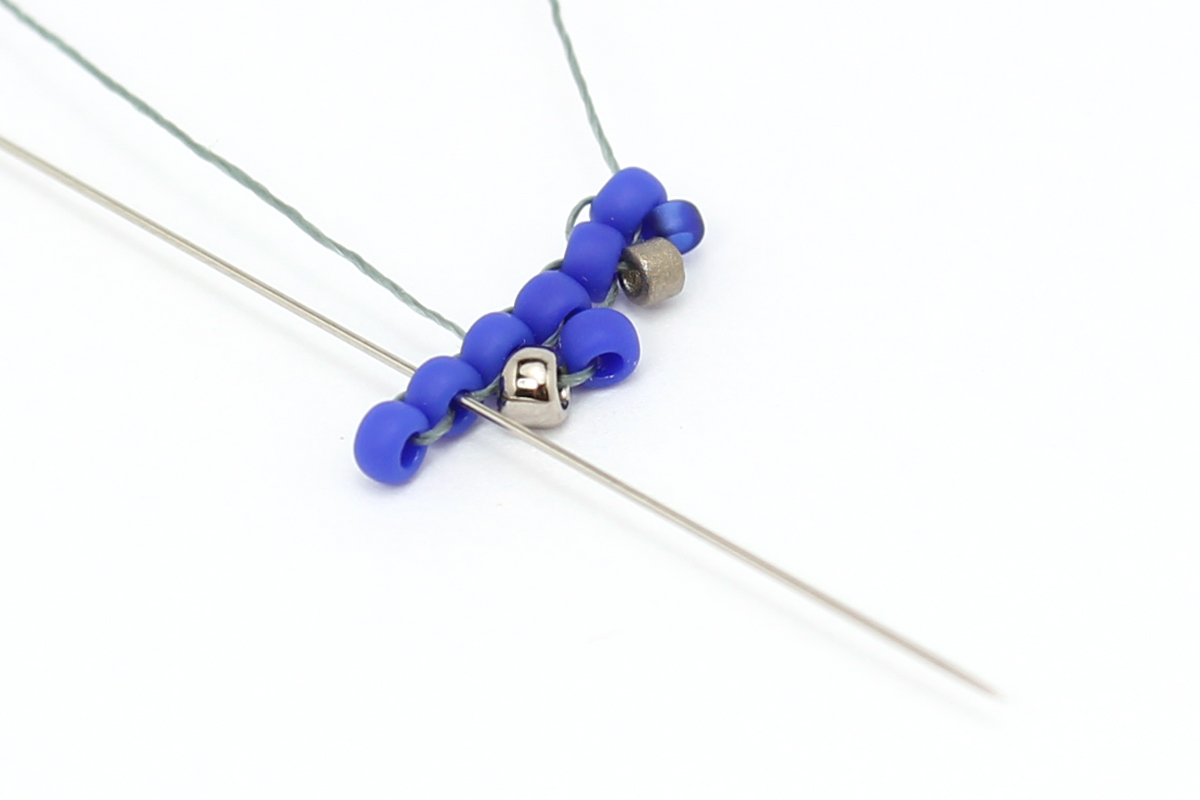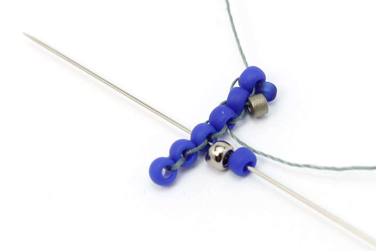 Набираем 2 бисерины 11/0 (#48F и #711), проходим иглой через 4-ю и 5-ю бисерины первого ряда: