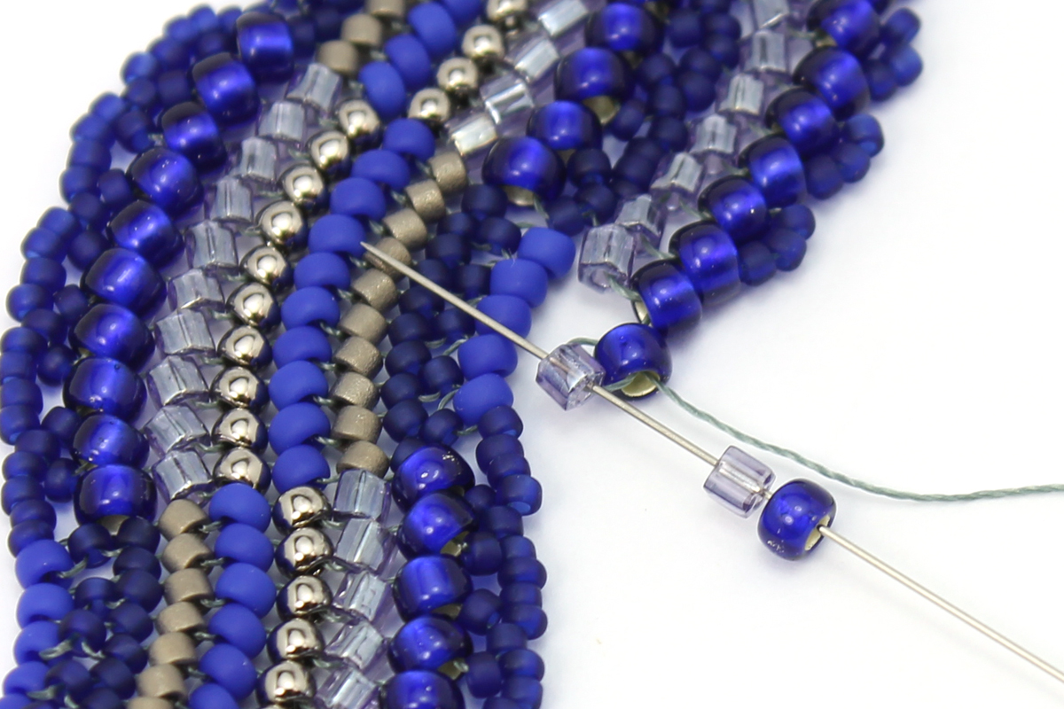 Затягиваем, набираем 8/0 и Hex, проходим через бисерину Hex предыдущего ряда.