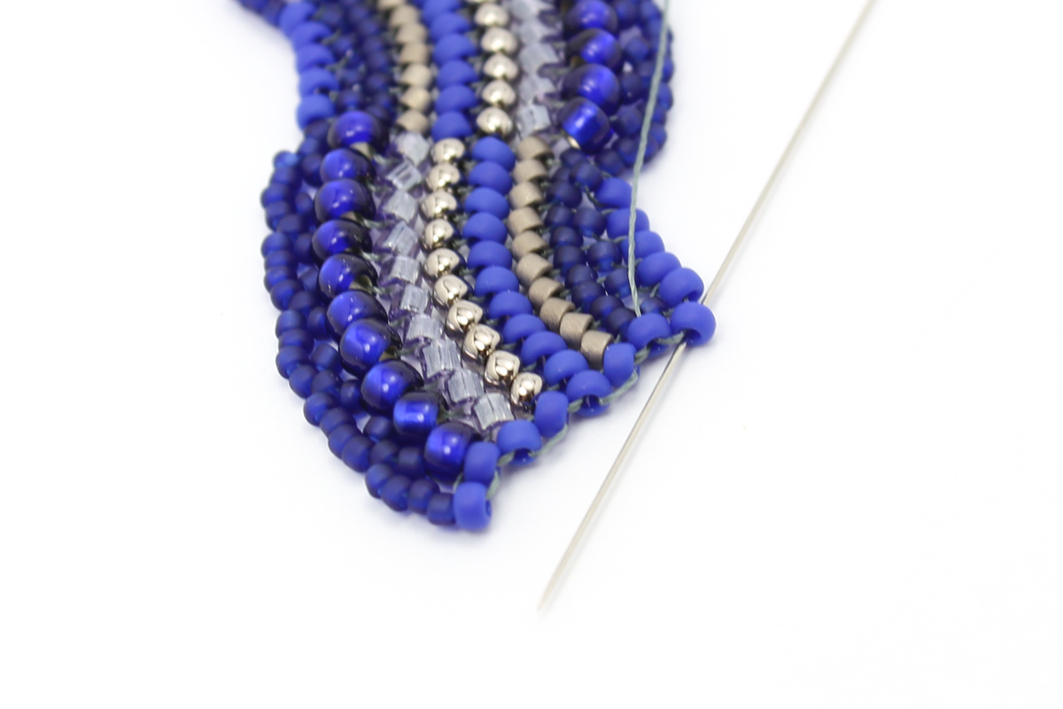 Проплетаем последние ряды в обратном направлении, чтобы закрепить бисерины. Прячем нити, прикрепляем замок.