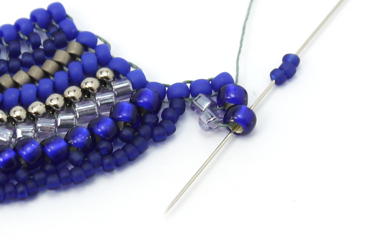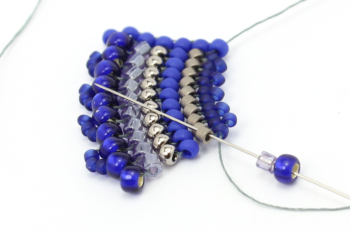 Теперь нам нужно, чтобы нить выходила из соседней бисерины, для этого проходим иглой через 3 бисерины 8/0, 3 бисерины 15/0 и через 2 бисерины 8/0 уже в обратном направлении.