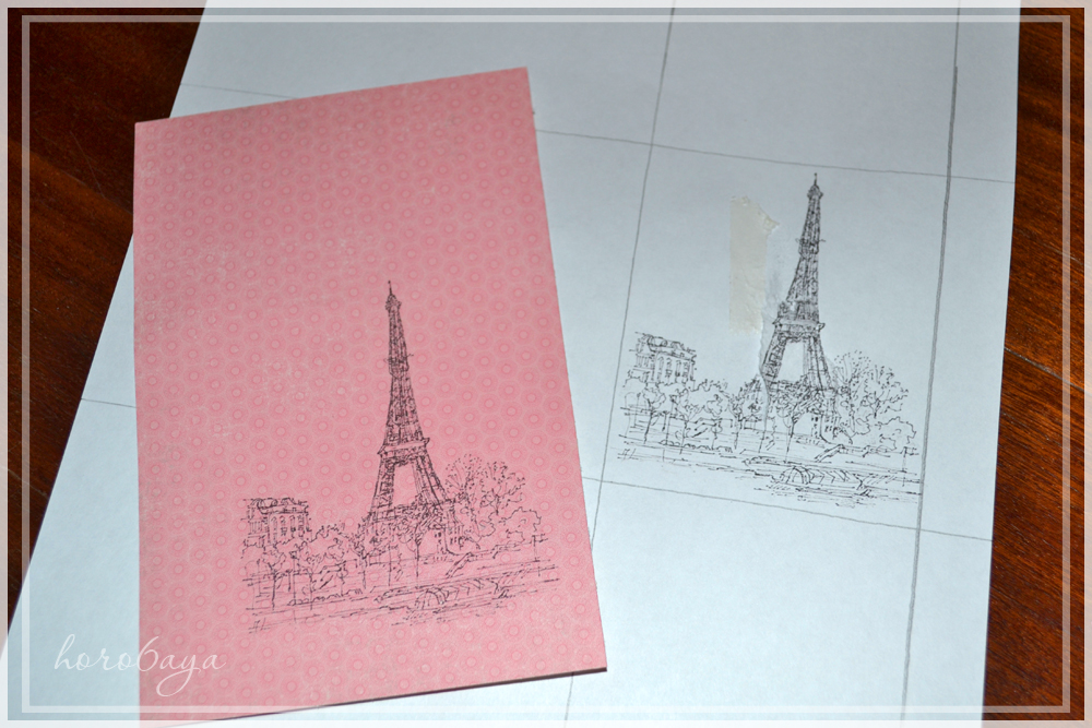 Теперь мне необходимо сделать так, чтобы накрыв картинку скрап-бумагой, я видела границы рисунка. Для этого я карандашом провожу линии по самым крайним точкам картинки: