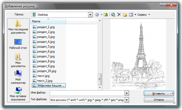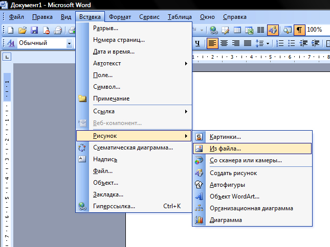 Вся трудность состоит в том, чтобы картинка оказалась именно в нужном месте. И как это сделать я вам сейчас расскажу. Итак, распечатаем нужную нам картинку на обычном офисном листе А4. Я распечатываю картинки всегда из Microsoft Word, поскольку там наглядно видно где будет картинка на листе и каков ее размер. Чтобы добавить картинку, нажимаем следующие пункты: Вставка - Рисунок - Из файла...