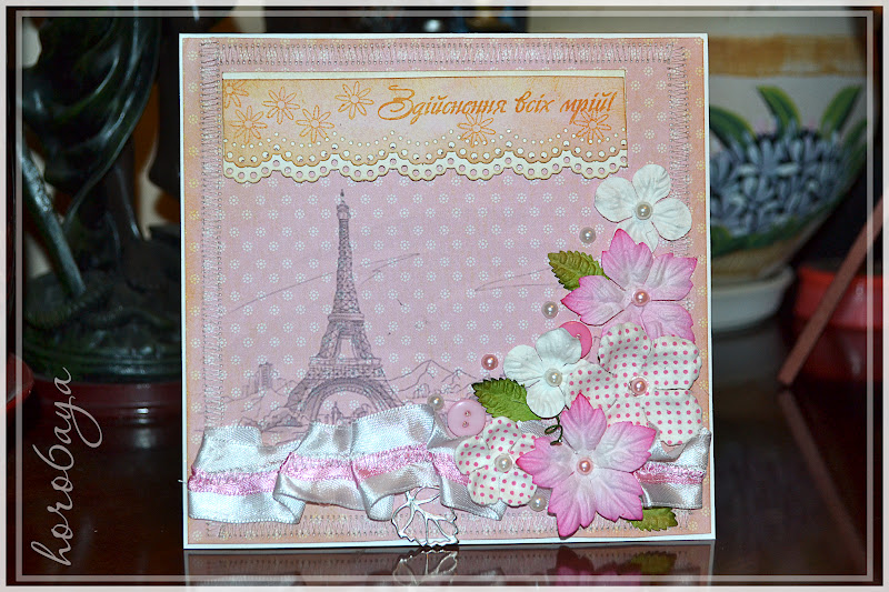 Ну а со вторым способом все будет не так просто. Бывает так, что надпись необходимо поместить просто на скрап-бумагу, в определенное место и без использования подложки. Например, в этой открытке Эйфелева башня была распечатала мною на принтере.