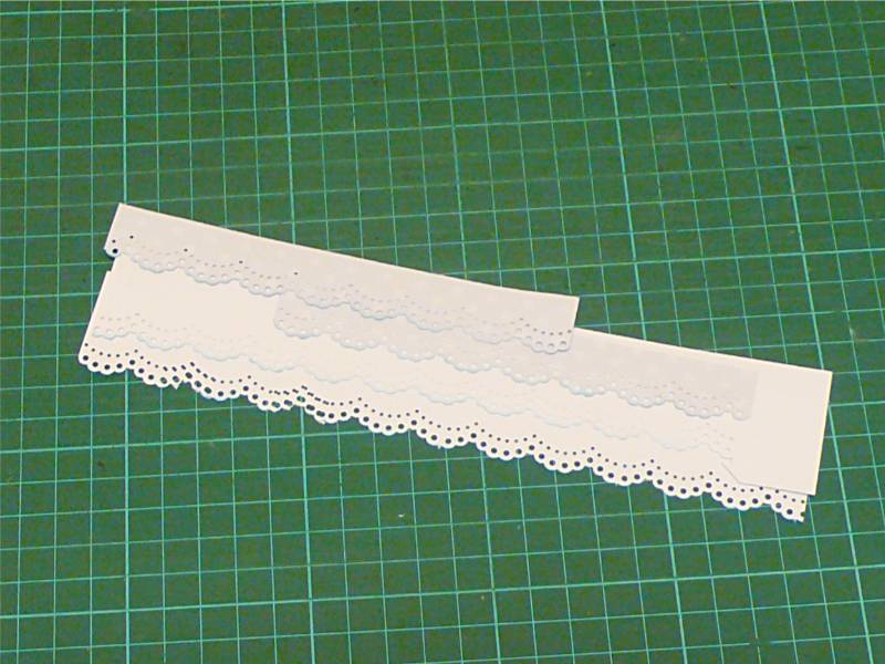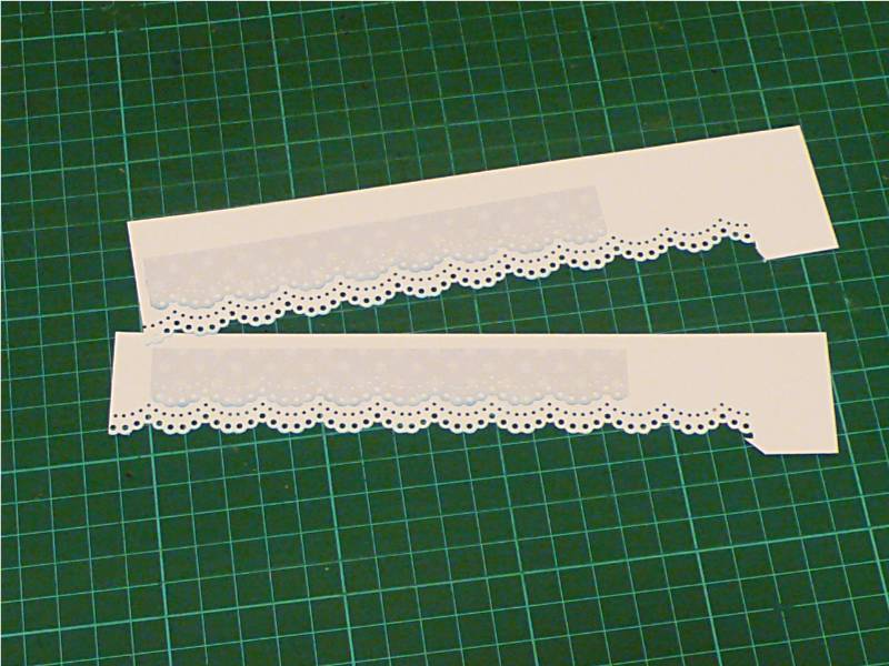 6. Приклеиваем цветную бумагу на белую, совмещая рисунок фестонов и регулируя необходимую ширину белого края (использую клей момент кристалл, так как он быстро сохнет, не "ведет" бумагу, а нечаянно выступившие капельки легко скатать чистым пальцем без ущерба для работы). Так как белые полоски вырезаны длиннее цветных и по длине, и по ширине, у нас есть возможность таких регулировок. После приклеивания обрезаем лишнюю белую бумагу.