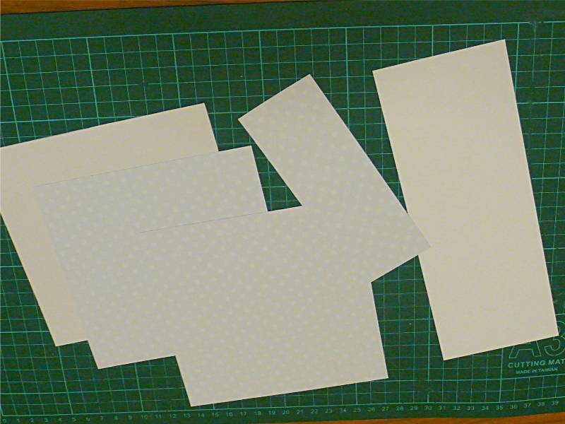 2. Из скрапбумаги вырезаем два квадрата для лицевой и тыльной сторон открытки. У меня основа для открытки размером 14,5х14,5 см, квадраты вырезаю чуть меньше - 14х14 см. Плюс из скрапбумаги дополнительно вырезаем полоску шириной 5 см и длиной, равной стороне квадрата - 5х14 см. Из белой бумаги отрезаем полоску шириной 7-8 см и длиной больше стороны квадрата на 2-3 см (лишнее потом отрежем)