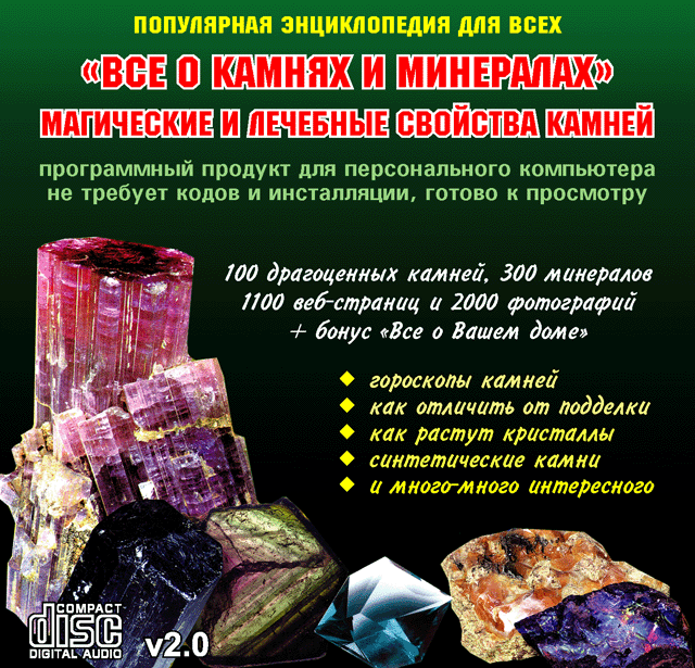 [показать] Предлагаем Вам популярную электронную энциклопедию для всех на компьютерном компакт-диске: каталог, магические и лечебные свойства камней. Более 100 популярных минералов и самоцветов, около 2000 фотографий, интересные статьи и материалы крупнейшего в Украине тематического портала о камнях и минералах. Амулеты и талисманы, астрология, гороскопы и знаки Зодиака, как найти свои камни, энергетическая очиститка камней, теория фэн-шуй, концепции у-син и инь-ян, руны.