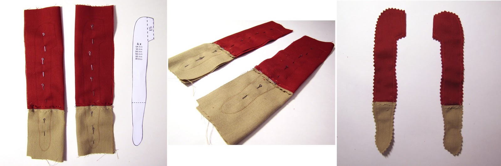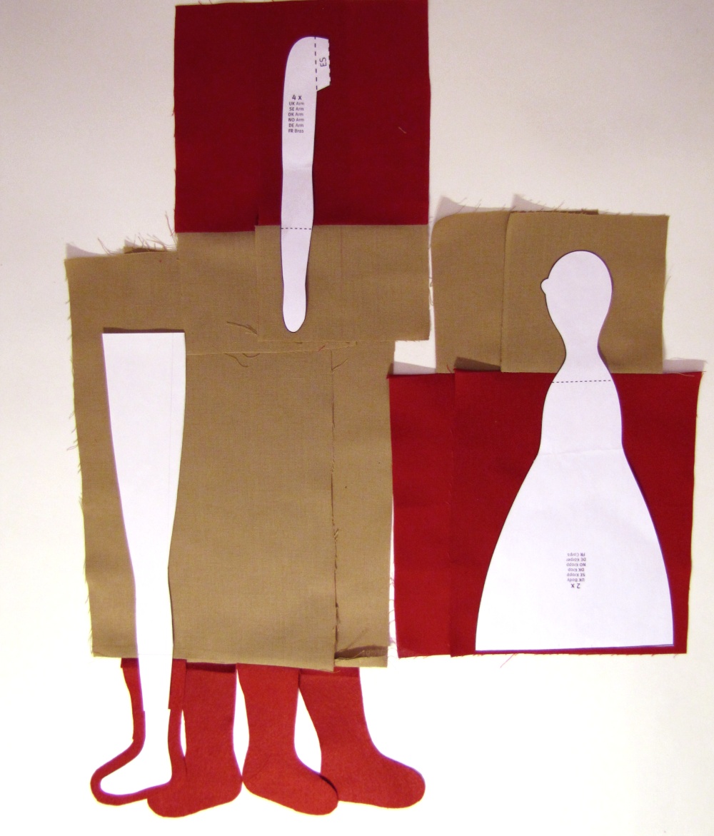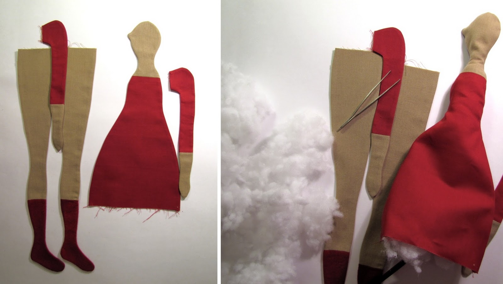 Выбираем 2 вида ткани – для тела и платья, а также для сапог – у меня они из фетра. На туловище, руках и ногах на выкройке указаны штрихпунктирные линии – это границы между тканями для тела и одежды. Определяем их размер, приложив выкройки, отрезаем нужное количество ткани и стачиваем их. У нас должно получиться 4 соединенных отрезка для ног, 4 – для рук и 2 – для туловища. После стачивания все разутюживаем.