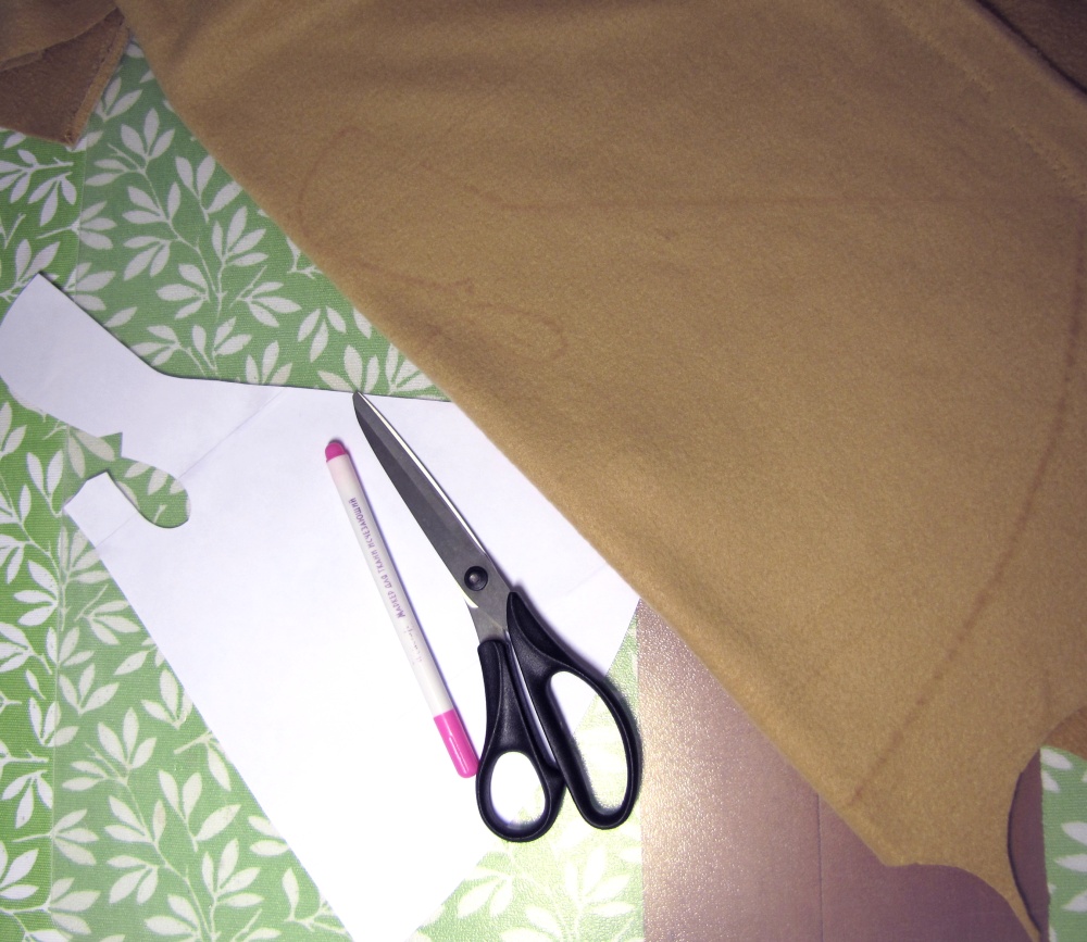 Складываем ткань (в моем случае – флис) пополам, лицевой стороной внутрь и обводим выкройку с помощью маркера. Вырезаем с учетом припусков на швы.