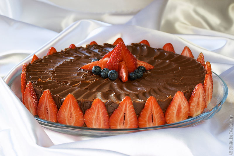 - клубника по краю торта держится лучше если ее "приклеивать" к слегка подтаявшему шоколадному крему. Просто дайте торту постоять перед украшением при комнатной температуре примерно 1 час.