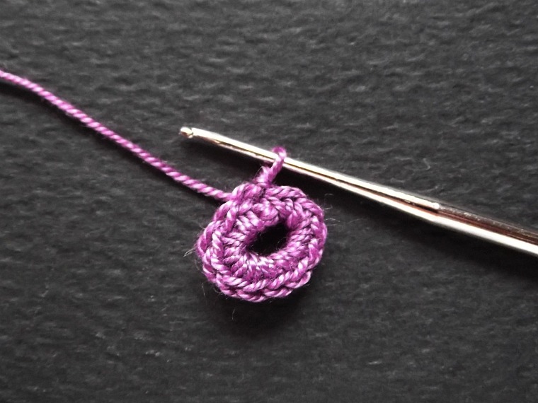 2. Обвязать кольцо 12 ст.б.н., вводя крючок в центр кольца. Закончить соед.п. с первой петлёй ряда.
