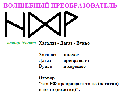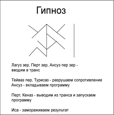 Центральная вязь – оператор, напоминающий сладкую конфетку, к которому должен придти объект. Крест из лагуз и двойного наута – это поток, который принудительно несет объект к оператору. По углам вязь кау+турисаз, которая расчищает объекту путь к оператору, для того, чтобы объект бежал к оператору сверкая пятками.