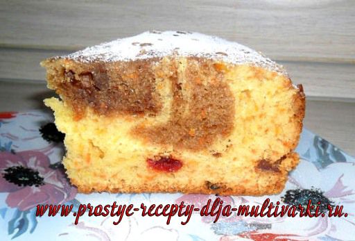 Выложите бОльшую часть теста в чашу мультиварки, а в нескольких местах сверху положите темное тесто, проведите по его поверхности деревянной шпажкой, рисую узоры. Чем глубже будете опускать палочку, тем ниже уйдет темное тесто. Так что с узороми на пироге можете пофантазировать!