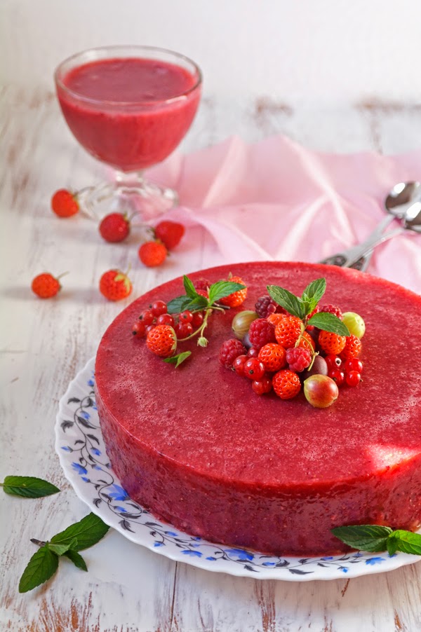 Залить торт клубничным желе, поставить в холодильник, чтобы верхний слой застыл. Аккуратно освободить торт от кольца (чтобы удобнее было снимать кольцо, я феном слегка прогреваю стенки формы), украсить целыми ягодами клубники и веточками мяты и можно подавать!