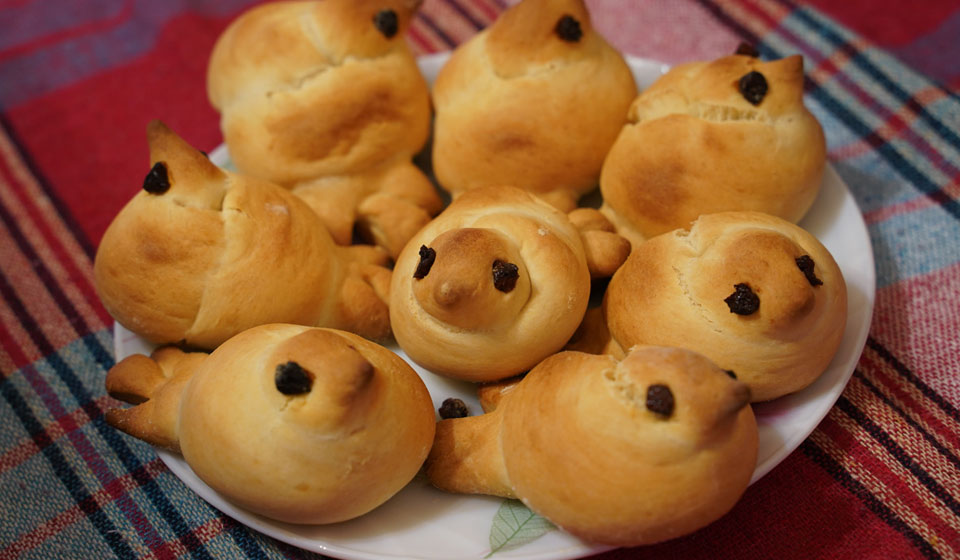 Существовало множество обрядов и традиций связанных с прилетом птиц. Например, маленькие колобки из теста хозяйки укладывали в гнезда. Считалось, что это поможет курам нести больше яиц. Конечно, печеные жаворонки были самой любимой забавой для детей. Птичек из теста насаживали на палочки, шесты и бежали с ними в поле, поднимались на холмик или крышу. Дети распевали песенки, зазывали солнце и тепло в родные края. И кормили птичек прилетевшим, например, воробышков, которые зимуют и ни куда не улетают или прилетевших грачей.