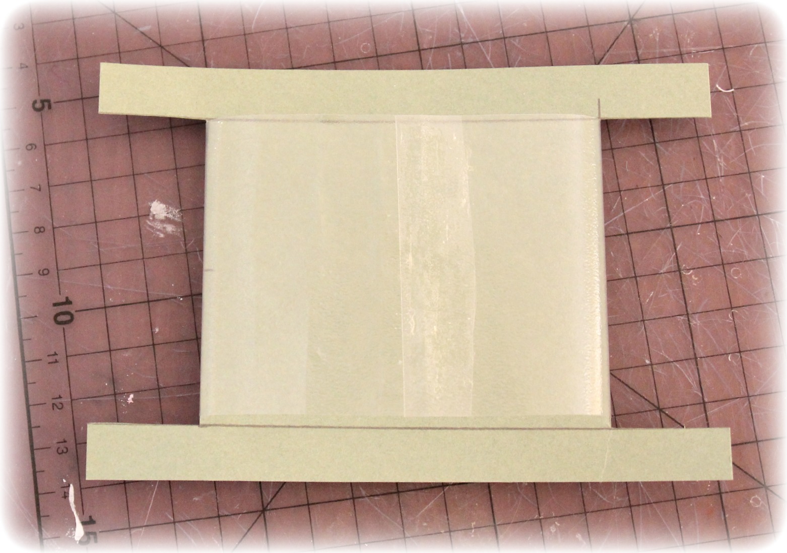 Сделали? Теперь проверьте, хорошо пленочка катается по детали? не туго? нигде не застревает? Теперь в ход идут маленькие детальки - приклеиваем первую, как показано на рисунке - так чтобы край был совмещен с внутренним краем выреза на большой детали - клеим на пленку, а второй край доходил до края основания большой детали.