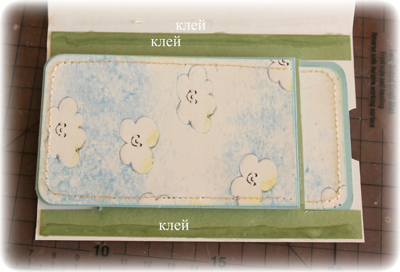 Дальше клеем промазываем края большой детальки зеленой у меня - не доходя до самой конструкции - и немного клея на сами зазоры основы открытки
