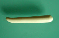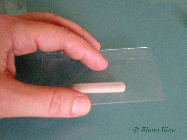 1. Раскатываем коническую колбаску стеклышком от фотографической рамки. Многие пользуются для раскатывания старыми пластиковыми дисконтными картами. Но стеклышко удобней тем, что мы можем контролировать толщину пальчика через стекло.