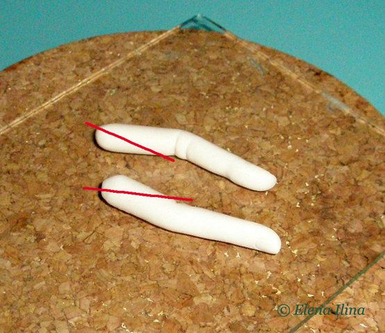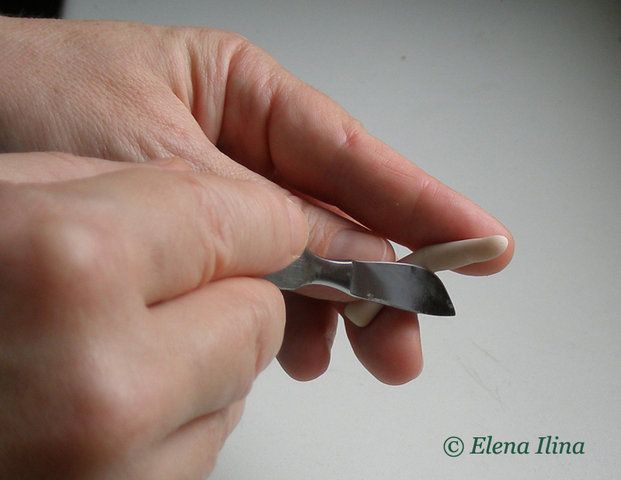 6. Формируем изгибы фаланг, слегка сгибая пальцы о грань ножа. Поправляем вмятинки, выглаживаем без пинена, иначе тонкие пальцы размягчатся и совсем не будут держать форму.