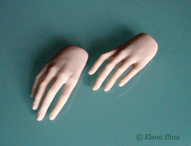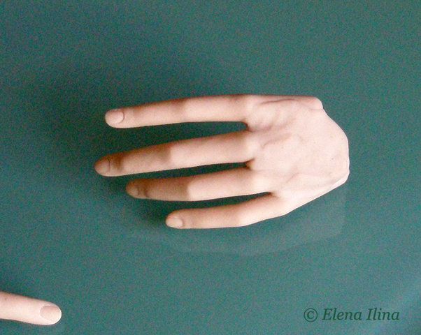 Основа этой технологии заключается в том, что сначала лепим и запекаем на пониженной температуре пальцы без ногтей, затем делаем ногти и собираем пальцы в кисть. Закрепляем полузапеком нужное положение пальцев и долепливаем всю кисть, уточняя ее форму и не боясь искажений уже затвердевших деталей.