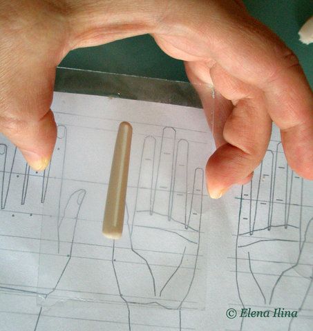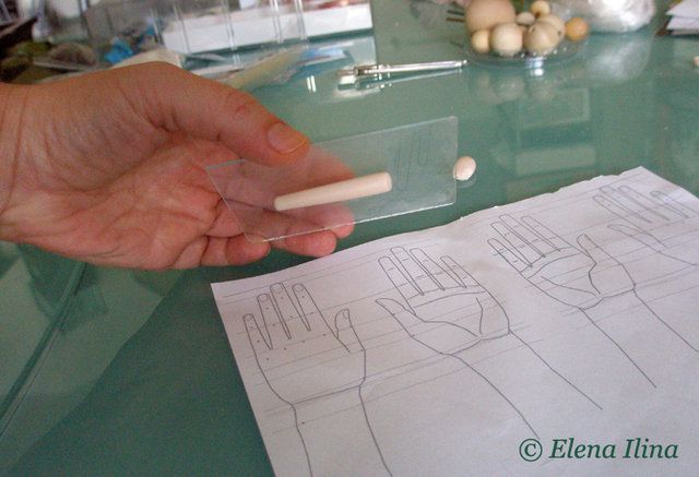 3. Пластик слегка прилипает к стеклу и это позволяет поместить нашу заготовку над схемой кисти для сравнения размера. На фото заготовка внизу под стеклышком. Я время от времени просто примеряю ее к схеме и продолжаю раскатывать до нужной толщины.