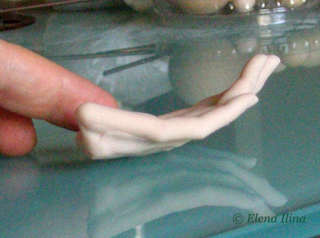 11. Формируем ладонь, тыльную сторону ладони, доводим кисть до нужной длинны, сверяясь со схемой. На этом этапе можно добавить выпуклости на суставы фаланг. Но не увлекайтесь, пальцы не должны выглядеть узловатыми. (Все тщательно примазываем инструментом и приглаживаем пиненом, не должно остаться ни одной нитевидной щелочки, царапинки, вмятинки. Все недостатки станут заметны при тонировании.) Я не делаю морщинок на костяшках пальцев, и сильных бороздок на ладони, для куклы мне кажется это грубоватым.