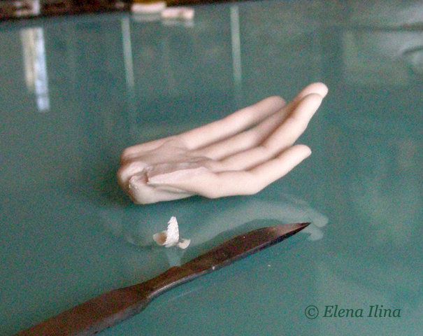13. Затем прилепляем заранее подготовленное предплечье и формируем запястье. Ручки готовы. Я даю им отлежаться минимум полдня (за это время свежий пластик въедается в полузапеченный, составляя монолит) и провожу еще один полузапек, на этот раз 30 или 40 минут, при той же температуре 90 °С. Шлифую с водой, запекаю окончательно 40 минут при 145 °С (вопреки указаниям производителя) и хорошая прочность обеспечена.