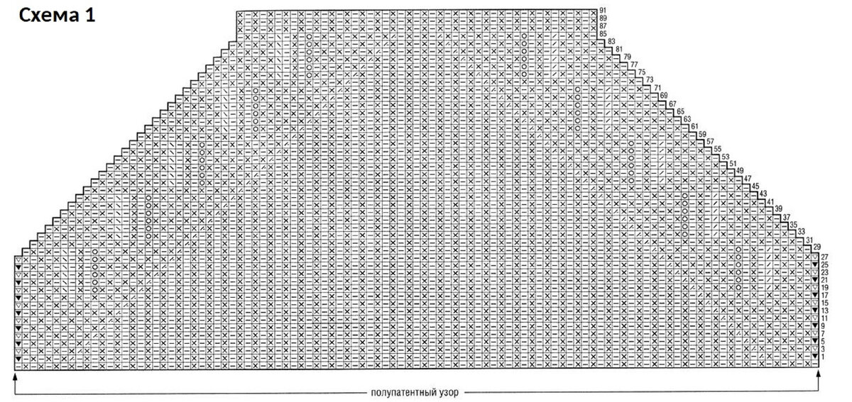Через 23 см от начала работы начать выполнение схемы с 1-го р.: кром. п., 105 п. схемы 1, кром. п.