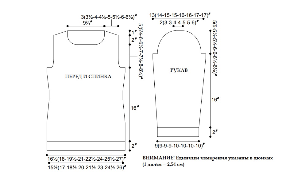Окончательные размеры (здесь и далее размеры приведены в дюймах. 1 дюйм = 2,54 см): обхват груди 33 (36, 39, 42, 45, 48, 51, 54) Длина изделия -26 (26½, 27, 27½, 28, 28½, 29, 29½)