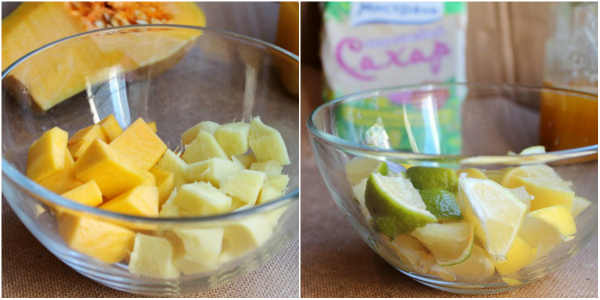 1. Подготовь ингредиенты. Лайм с лимоном ошпарь кипятком и нарежь дольками вместе с кожурой. Тыкву и имбирь очисти, нарежь кусочками.