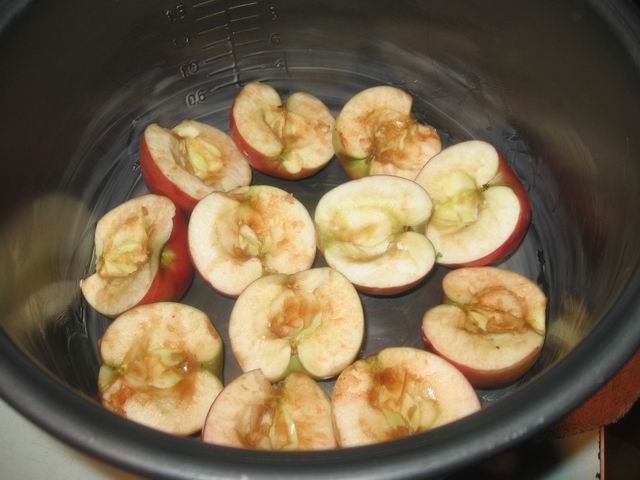Из яблое удалить сердцевину, уложить в смазанную сливочным маслом кастрюлю мультиварки.