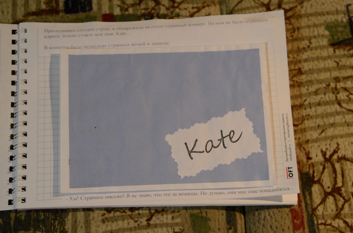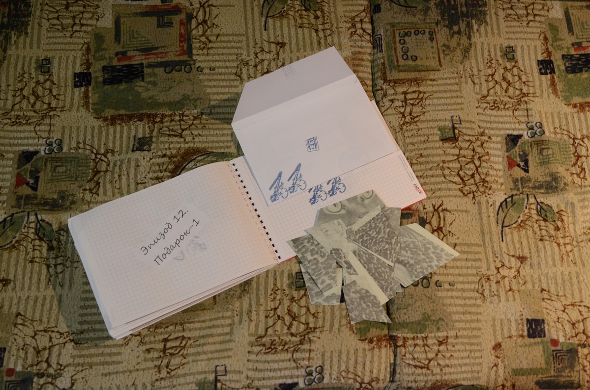 На странице блокнота с первым эпизодом помещен конверт, в котором лежит эта записка... А реплики вклеены вокруг места для конверта... Все доп. элементы также находились в конверте... И так далее...