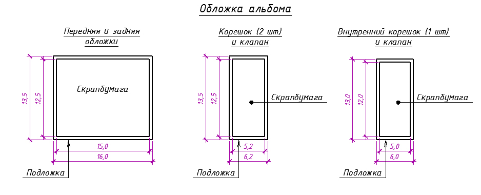 На схеме даю размеры и подложки из обложечного картона и размеры раскладушки из скрапбумаги. Размеры раскладушек везде меньше подложек на 1 см. А размеры прослойки из фактурной бумажки между ними не даю, чтобы не путать схему))) И так видно, что на глаз обрезано...