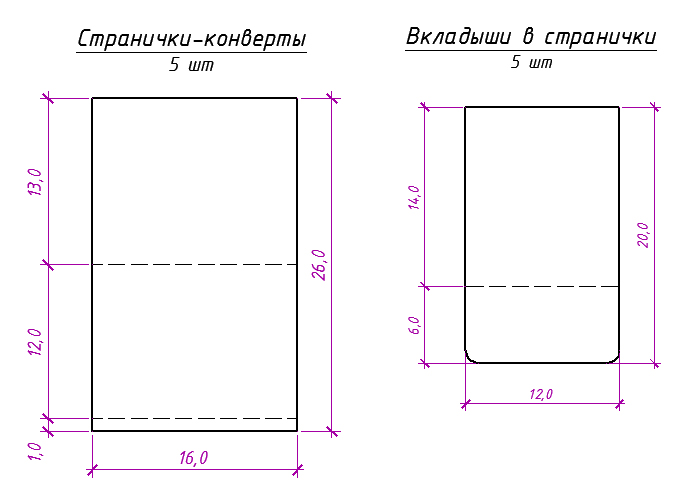 Далее делаем странички-конверты. У меня их 5 штук - бигуем по пунктиру, складываем. Алена делает биговку на доске, поэтому сгиб получается объемным. У меня нет такого чудо-инструмента, поэтому конвертики получились плоские. Объёмные, конечно, лучше будут)))