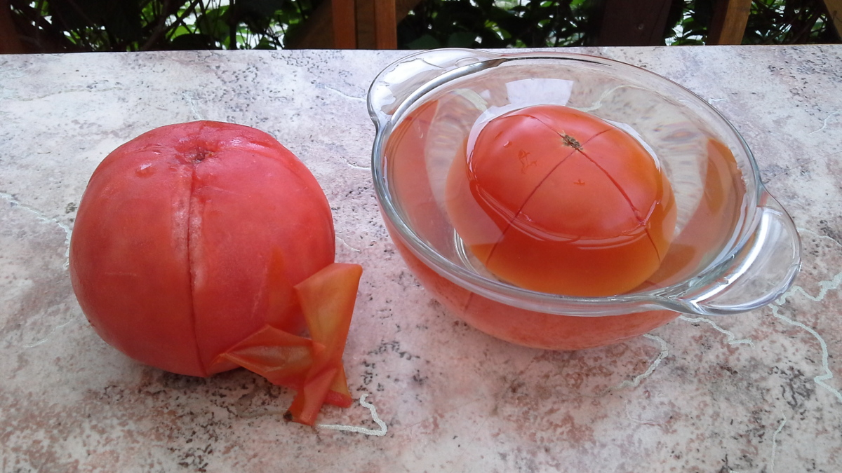 Для этого делаем насечки ножом на помидорах, кладем их в кипяток на 1 минуту, потом в холодную воду. Шкурка легко снимается.