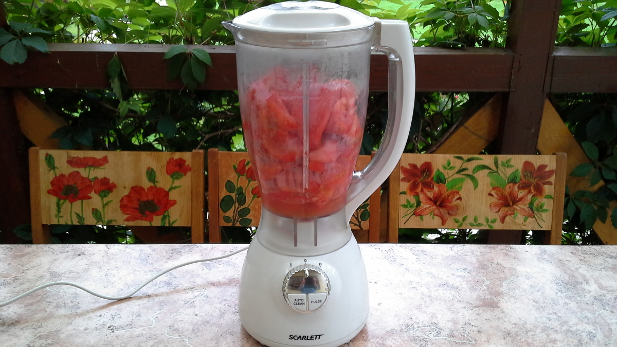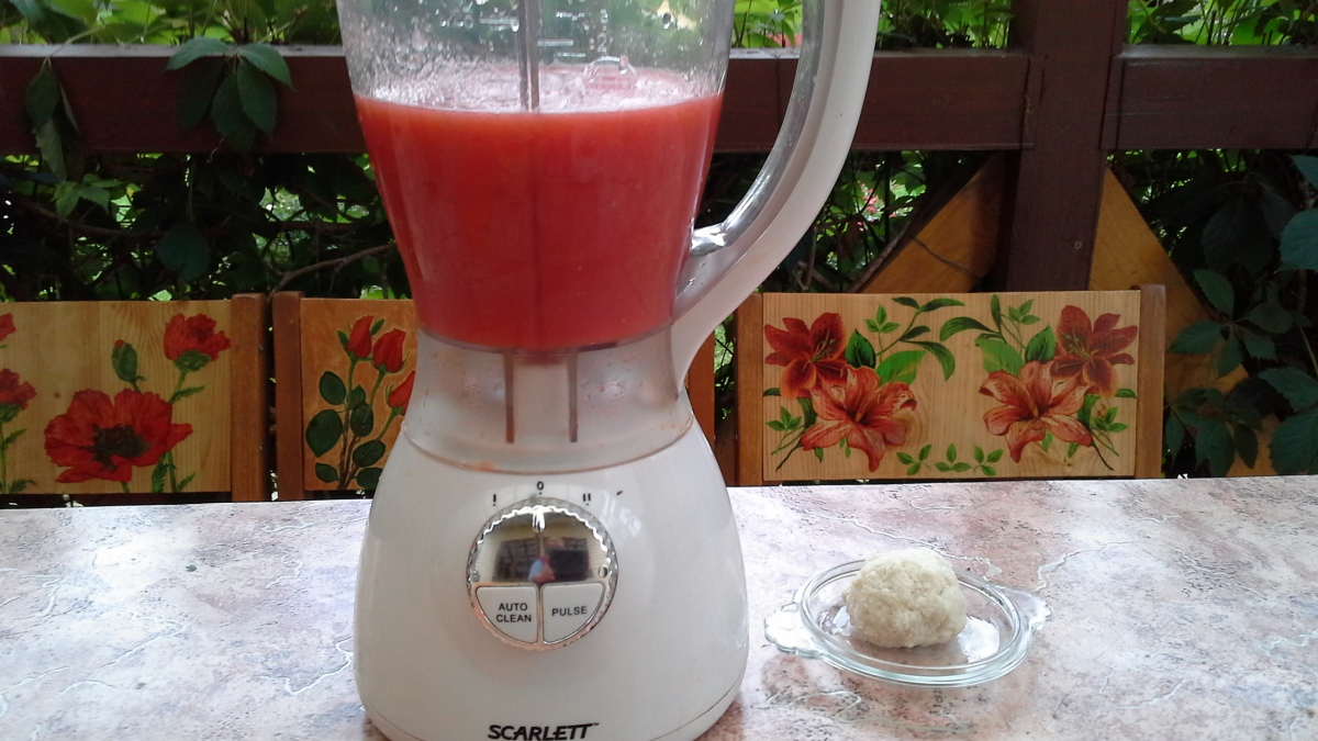 Помидоры порезать, убрать плодоножку, взбить в блендере.