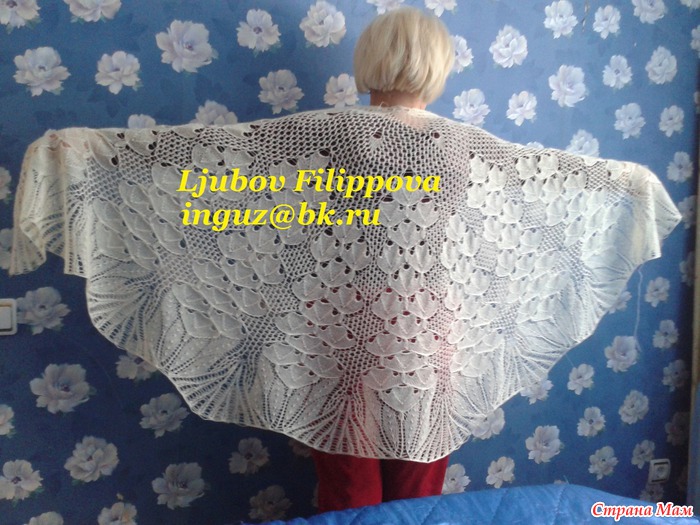 Требуемом количестве пряжи для шали "Вивьен", при метраже 230 м / 50 г (100 % шерсть) на полную шаль (268 рядов) понадобится 280-290 г пряжи (или 1288-1334 м). Спицы № 2,5