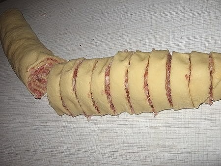 Скручиваем в трубочку и нарезаем на кусочки по 1 см.