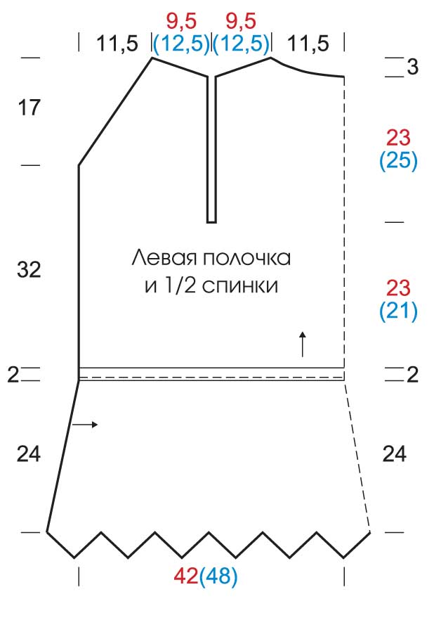 Через 46 см от начала основного узора оставить с обеих сторон для скосов плеча 3 (4) см непровязанными и повторить такие убавления в следующем ряду.