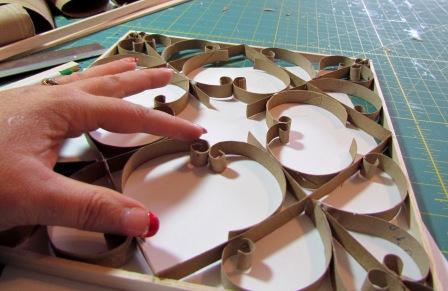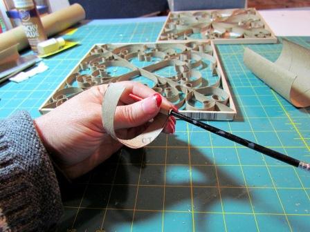 Из трубочек от бумажных полотенец вырезаны прямые длинные полоски, которые разбивают орнамент на части. Полоски нарезать по длине трубки. Для завитков вырезаны полоски из трубочек от туалетной бумаги. Трубу разрезать пополам и по ширине трубы нарезать полоски. Все полоски вырезаны шириной около одного сантиметра. Если нужно получить очень закрученный элемент, конец полоски накрутить на карандаш.